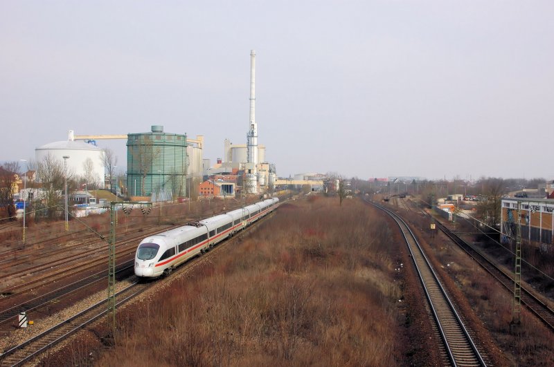 Weißwurst mit Zucker: Nicht allzuviel Zeit sollten sich Freunde dieses Motives mehr gönnen, da voraussichtlich im Frühherbst 2009 die Zuckerfabrik mit ihrem markanten Schornstein abgerissen wird. Hier passiert ein ICE-T nach Wien die Fotostelle in Regensburg. (14.03.09).
