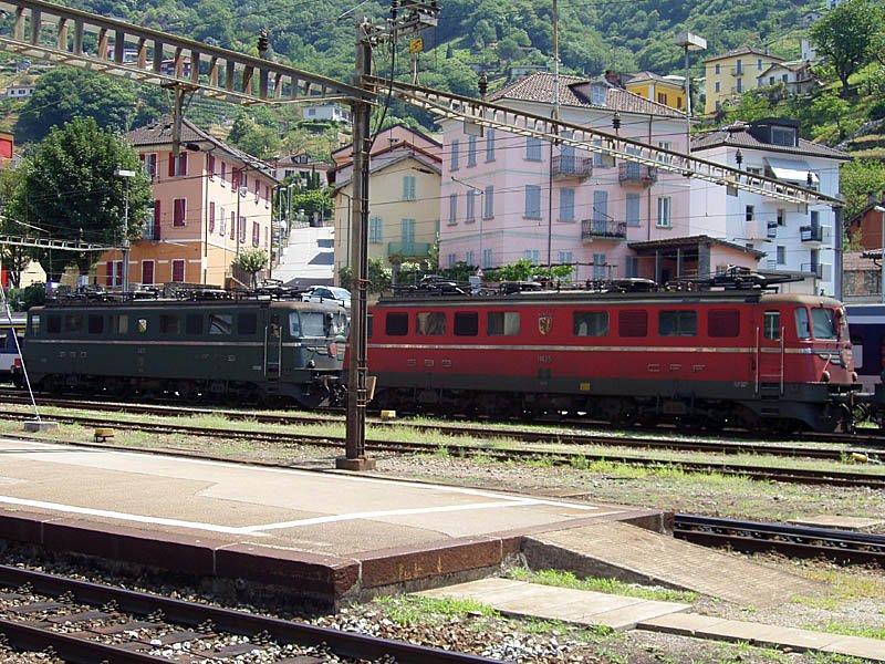 Ae 6/6 (11415 Thurgau) und Ae 6/6 (11425 Genève), beide noch mit Wappen, in Bellinzona am 29. Juni 2003. 11425 Genève wird dank Aufnahme durch SBB Historic längerfristig erhalten bleiben.