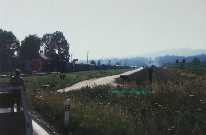Hof - Bad Steben ca. 1989. Bahnhof Stegenwaldhaus, Ausfahrt eines 798 nach Selbitz/Naila. Wer genau hinsieht erkennt, dass rechts die Ladegleise nicht mehr angebunden sind und rechts neben dem Zug das Überholgleis schon ausgebaut ist. Das Streckengleis liegt immer noch und wird auch benutzt...