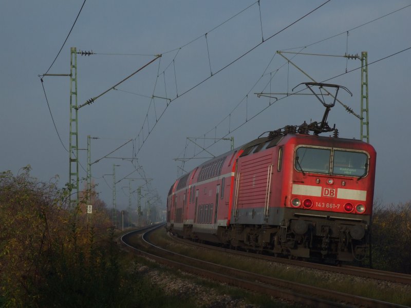 143 661 schiebt am Morgen des 08.11.2008 ihre Regionalbahn in Richtung Koblenz Aufnahme bei Gau Algesheim