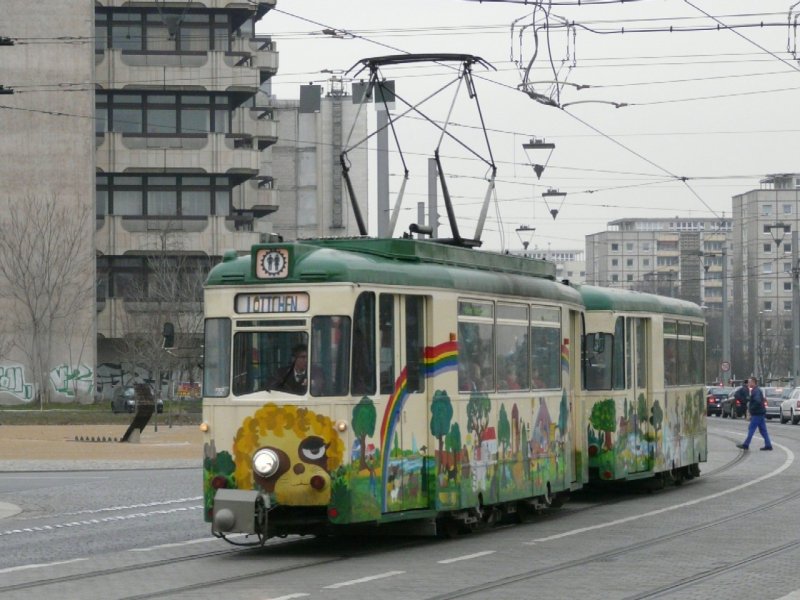 Eine Combino-Straßenbahn in der Gefällestrecke kurz vor der Haltestelle Eugen-Bolz-Straße. Die aufwändigen Oberleitungen sind an seitlichen Masten aufgehängt, eigentlich recht fotografenfreundlich, da die mastenfreie Seite den Blick auf die Bahn freilässt. Allerdings sind die Fahrleitungsanlagen alles andere als unauffällig.