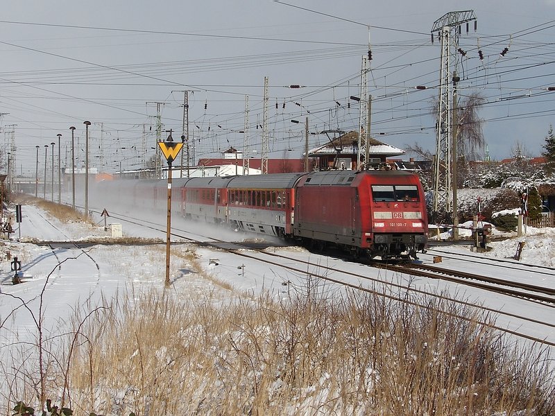 101 109 mit EC 379 bei der bei der Vorbeifahrt am Stellwerk Abzw. Srg. (17.02.09)