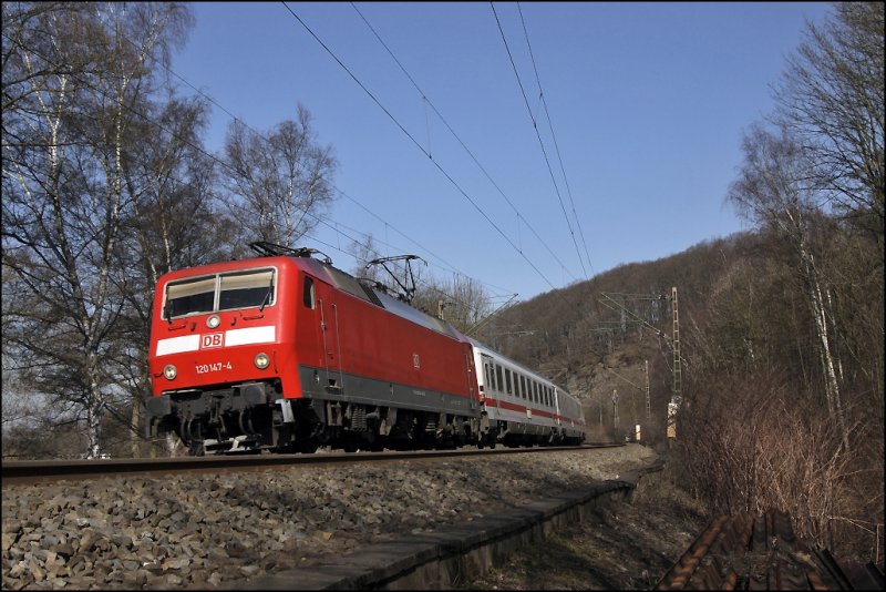120 147 (9180 6120 147-4 D-DB) bringt den IC 2023, Hamburg-Altona - Frankfurt(Main)Hbf, in die Mainmetropole und legt sich hinter Witten in die Kurve.