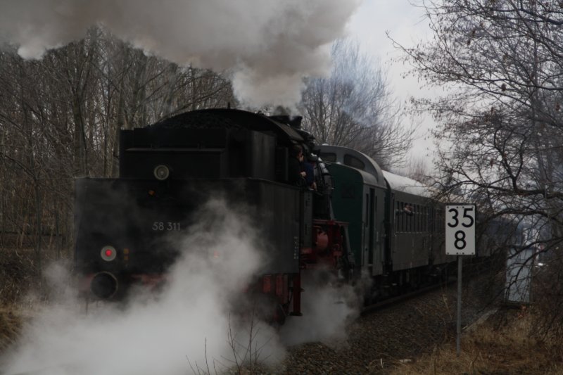 50 3648 und 58 311 passieren unter voldampf am 28.03.09 die Mauern des ehemligen Überschneidungsbauwerk der Zwönitz-Stollberger Strecke. 58 311 muss sich als Schublok ganz schön ins Zeug legen.