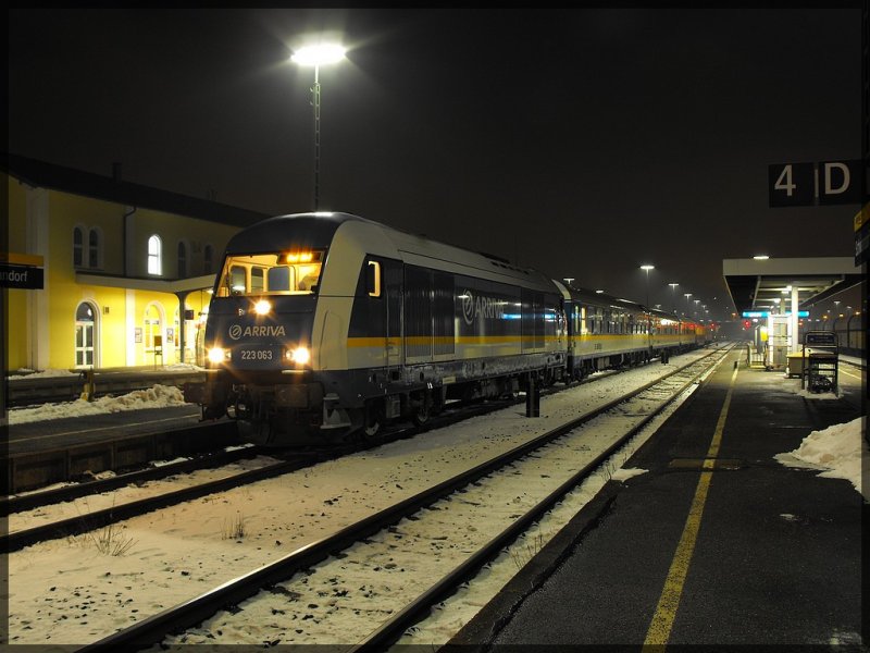 Hof Hbf am 27.02.2009. Da konnte ich den intr. Zug 2Loks - 2Wagen ausfahrbereit stehen sehen. D06 und ein 223 hatten einen Sitzwagen und einen TEE-Speisewagen am Haken. Leider schaffte ich einen Ortswechsel nicht mehr bevor die Garnitur losfuhr....