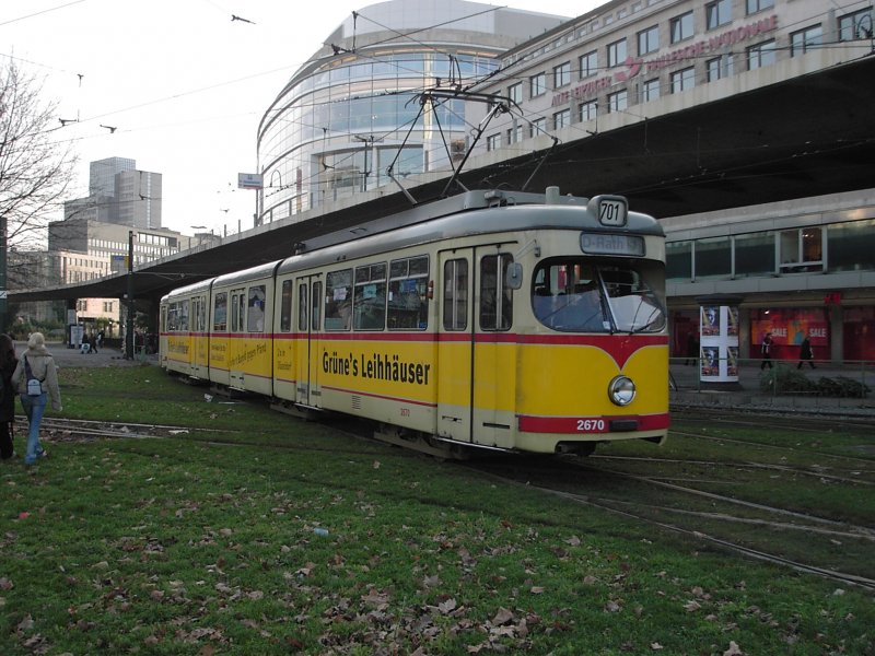 Achtachsiger DUEWAG-Gelenktriebwagen mit vierachsigem Beiwagen am Jan-Wellem-Platz in Düsseldorf als Linie 701 nach Düsseldorf-Rath.