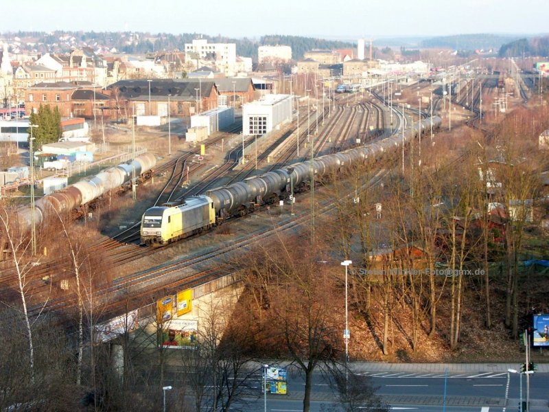 Dispolok ER 20-0002 verlässt am Abend des 30.03.2009 den Hofer Hauptbahnhof und geht Richtung Sachsen auf die Reise. Über dem Lok (so soll das bei der Type wohl heissen- haha) ist der alte Ringlokschuppen des ehem. sächs. Bw in Hof. Vor 25 Jahren standen da die Bahnbusse drin....