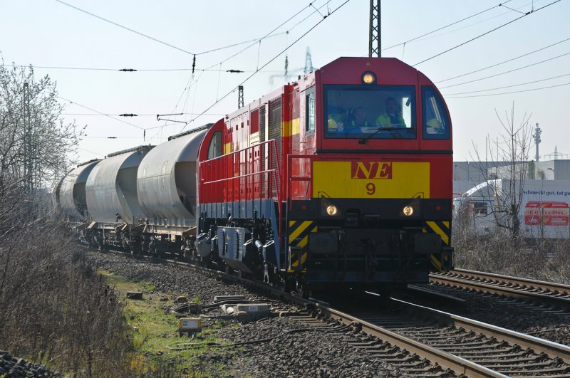 Lok 9 der Neusser Eisenbahn fährt mit einem Kesselwagenzug von der Angertalbahn am Abzg. Linttorf in die Hauptstrecke Richtung Norden. 31.03.2009