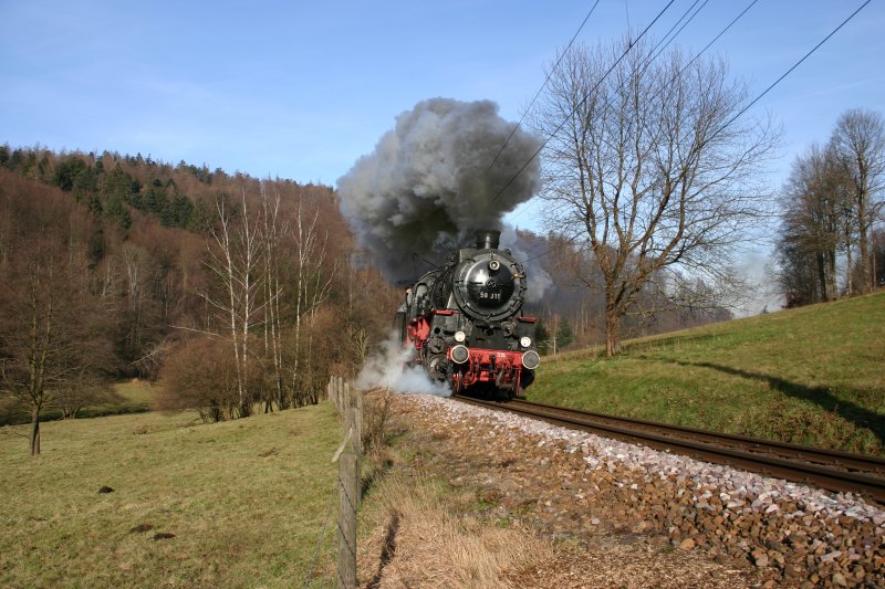 Die 38 3199 brachte unseren SDZ nach Neuenmarkt-Wirsberg, hier auf der Rückfahrt beim Wasserhalt