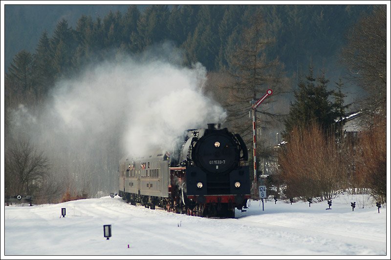 01 1533 (ÖGEG Lok 01 533) mit dem IGE Sonderzug E 16188 am 28.2.2009 bei der Ein-/Durchfahrt in Holzleithen.