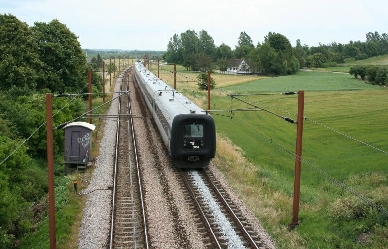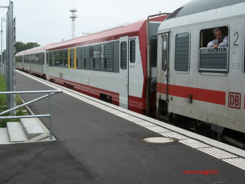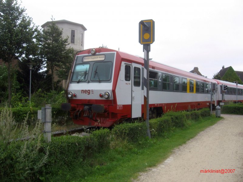 Der Triebwagen T4 der neg befindet sich jetzt in der Mitte des Zugsverbands. Vorne der neg-Steuerwagen und hinten am Haken die IC Kurswagen. Der Zug fährt in Richtung Dagebüll-Mole ab, wo die Reisenden bequem auf die Fähren nach Amrum und Föhr umsteigen können.