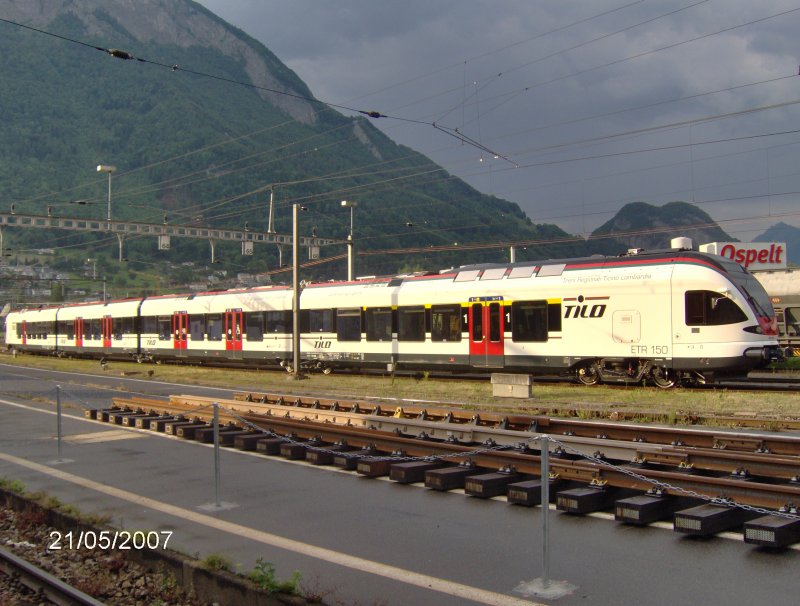 RABe 524(ETR150)nach einem Sommergewitter abgestellt am 21.05.2007 in Sargans wo er zu Testfahrten im Rheintal abbestellt worden war.