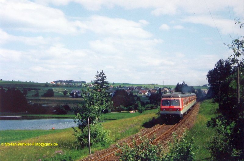 650 Jahre Köditz : Ca. 1987 fährt ein 614er am Köditzer Badeteich vorbei Richtung Bad Steben. Hinten die Ortschaft, noch ohne Neubaugebiet links am Hang.....