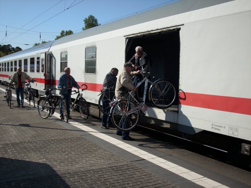 Fahrradverladung am 09.Mai 2009 in Binz.Hier wird der im Uex 1805 Binz-Köln mitführende Fahrradwagen von Mitreisenden beladen.