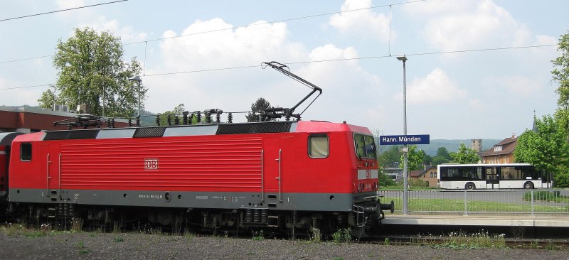 143 180-8 steht am 2.05.09 in Hann. Münden mit dem RE 26156 aus Halle (Saale) Hbf und wartet auf die Abfahrt Richtung Kassel Hbf. Im Hintergrung steht noch ein Linienbus der Verkehrsbetriebe Süd-Niedersachsen.