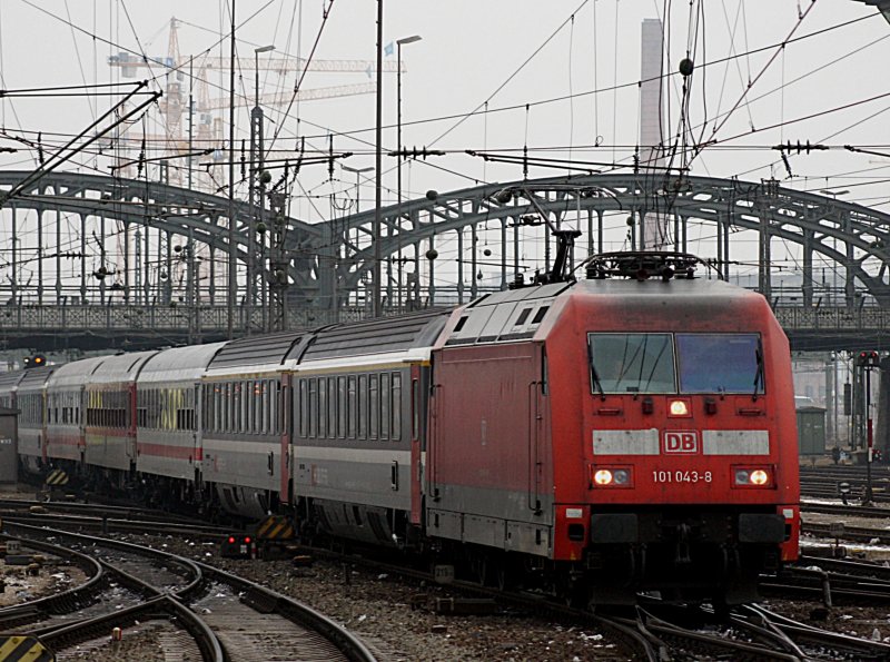 Die 101 043 am 07.01.2009 mit einem ICE Ersatzzug bei der Einfahrt in den Münchner Hbf.