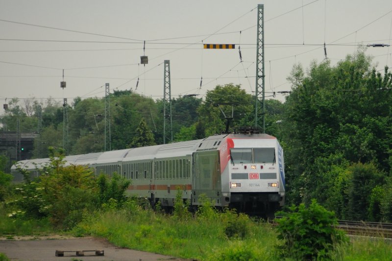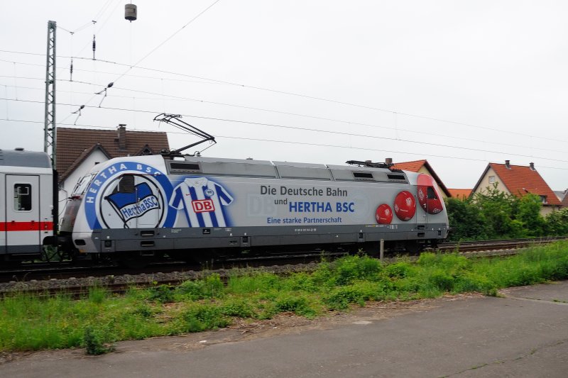 Und dann kam sie: 101 144 "Hertha BSC" mit Intercity 2273 nach Karlsruhe. Das einzige Manko, sie schob, und somit mußte ich warten, bis sie anfuhr, da sie durch die Bahnsteigbaustelle außerhalb des Bahnsteigbereiches hielt. (Bensheim Bhf, Bergstrasse, 14.05.2009).