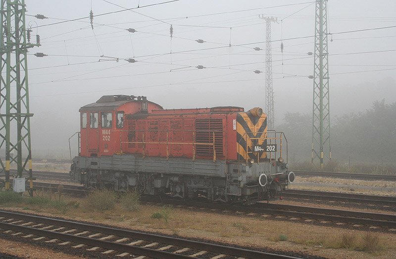 Am äußerst nebeligen 26. September 2005 tuckert die M44 202 durch den Grenz-Bahnhof Hegyeshalom.