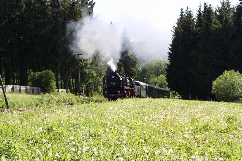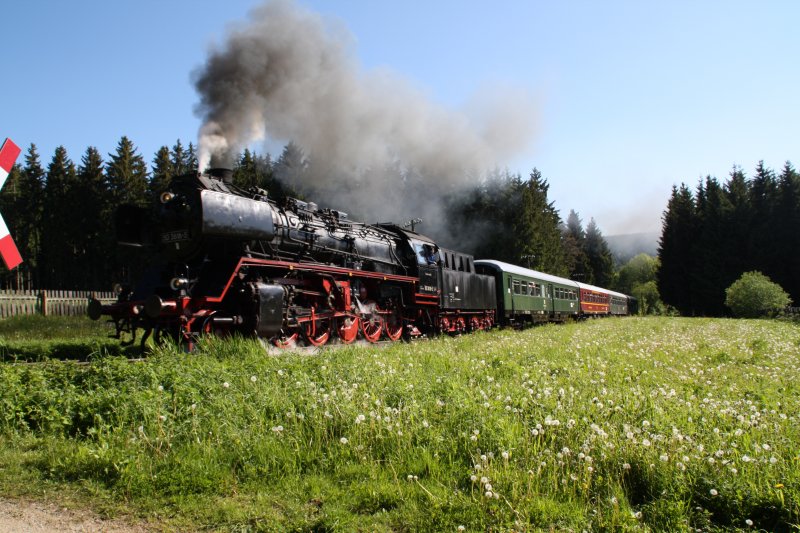 50 3616-5 ist mit dem VSE Museumszug am 23.05.09 zwischen Walthersdorf und Sehma unterwegs. Hier am Bahnhübergang eines Waldweges.