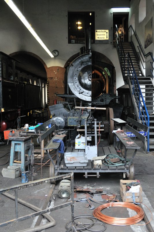 Draufsicht auf die Bayrische BBI Nr. 2100, Baujahr 1896. Diese Lok wird gerade als Schnittmodell hergerichtet. links die intakte Seite, rechts der Längsschnitt durch die Lok, welcher perfekt das Innenleben einer Dampflok zeigt. (Neustadt/Weinstrasse, Mai 2009).