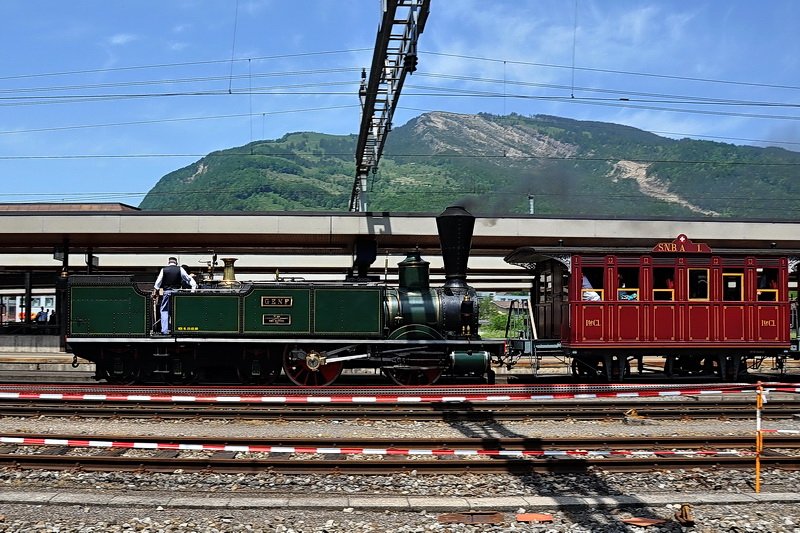 Dampfloktreffen Goldau 24.Mai 2009. Die Ec 2/5 28 "Genf" mit einem Spanisch-Brötli-Bahn-Wagen der 1. Klasse im Bahnhof Arth-Goldau.