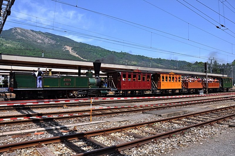 Dampfloktreffen Goldau 24.Mai 2009. Die Ec 2/5 28 "Genf" und den Spanisch-Brötli-Bahn-Wagen zur Fahrt nach Immensee an einem herlichen und heissen Maisonntag und die Fahrgäste strahlen mit der Sonne um die Wette.
