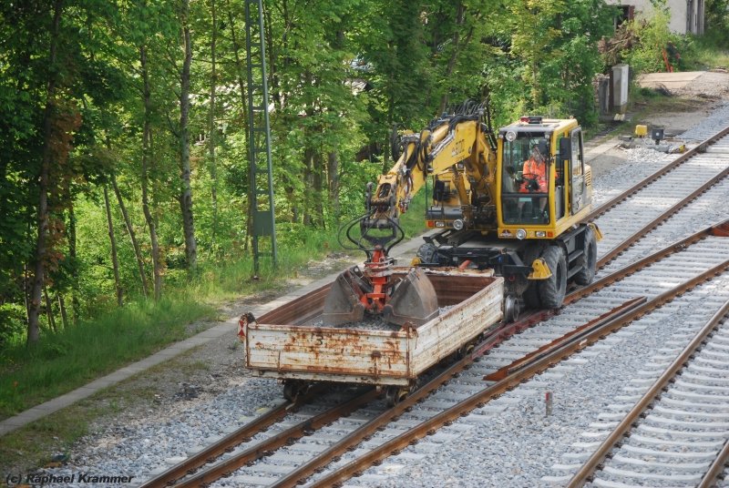 Es wird gebaut.. am 21.05.09 im Bahnhof Memmingen. Zu Ausbesserungsarbeiten an verschiedenen Stellen des Bahnhofs waren teilweise bis zu drei Zwei-Wege-Bagger unterwegs.