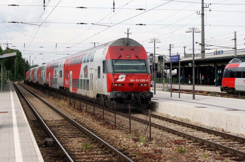 REX2797 mit CS-Steuerwagen 80-73 008 von Wien Süd nach Oberwart bei der Einfahrt in Wien Meidling, 28.05.2009.