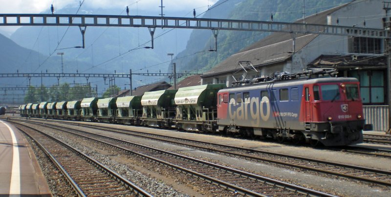 SBB-Cargo: Die Ae 610 508 "Wettingen" wird diesen randvollen Schoter- und Steinzug, aus dem Bahnhof Erstfeld ziehen. (29.5.09)