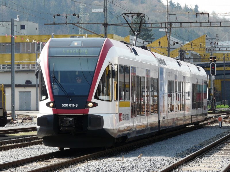 SBB - Triebzug RABe 520 011-8 im Bahnhof Suhr bekommt soeben den Abfahrtsbefehl mit winken der Kelle am 09.04.2009