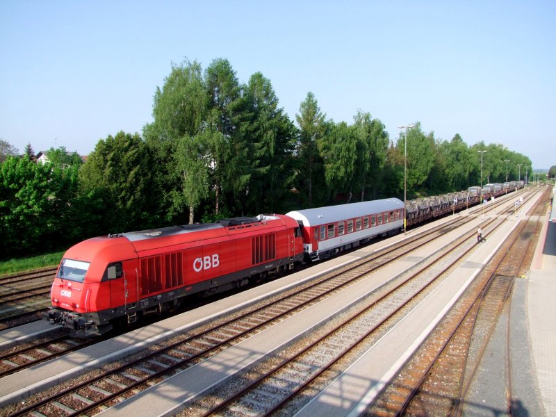 2016 065-1 trifft mit SGAG90142 bestehend aus 10Wagen(42Ax),265m,494To am Bhf. Ried i.I. ein 090503