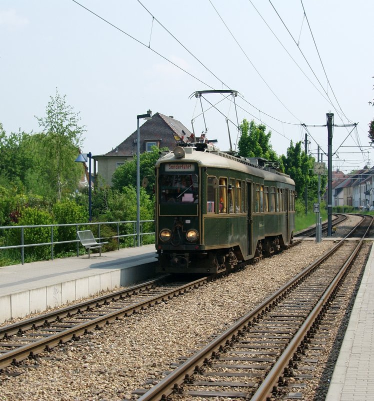 Der historische Halbzug der OEG war am 02.05.09 anlässlich des 100 Jährigen Jubiläums der Strecke Heddesheim-Käfertal unterwegs, hier am Bahnhof Wallstadt.