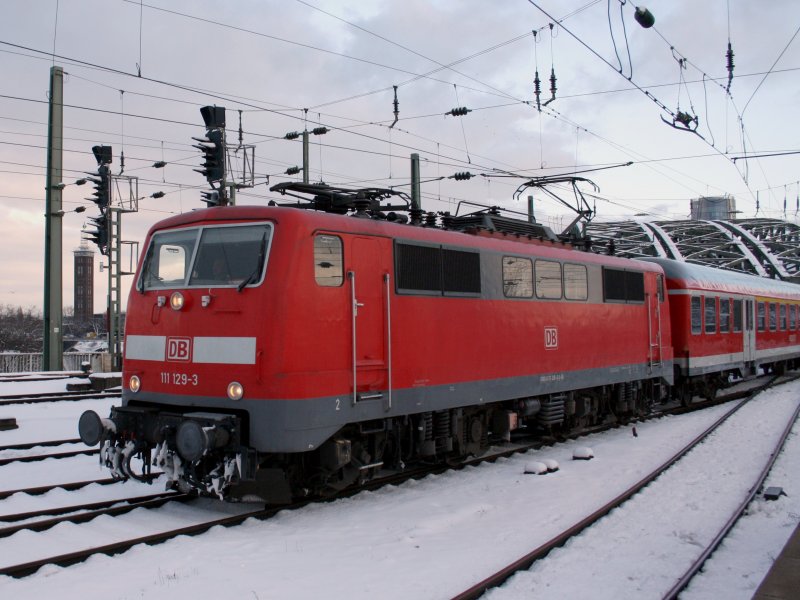 Die 111 129 am 05.01.2009 mit einer RB bei der Einfahrt in den Kölner Hbf.