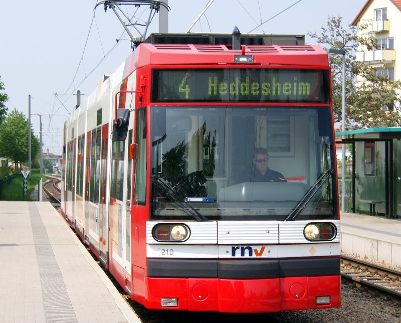 GT6N 210 der VBL am 02.05.09 bei der Einfahrt am Bahnhof Wallstadt. An diesem Tag durfte man anlässlich des 100 Jährigen Jubiläums alle Bahnen zwischen Käfertal und Heddesheim kostenlos nutzen.