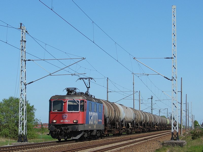 RE 421 378 mit einem Kesselzug bei der Durchfahrt durch die Ausweichstelle Stralsund-Langendorf. (01.05.09)