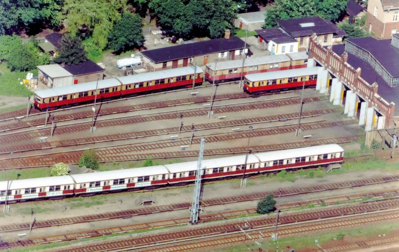 Der Zug nach Wolsztyn trifft in Erkner ein. Er ist in Berlin-Schöneweide gestartet und fährt zur Dampflokparade. Wegen hoher Waldbrandgefahr konnten die anreisenden Sonderzüge nicht mit Dampfloks bespannt werden, mit Ausnahme des aus Chemnitz kommenden Zuges mit der ölgefeuerten 18 201. 2.5.2009