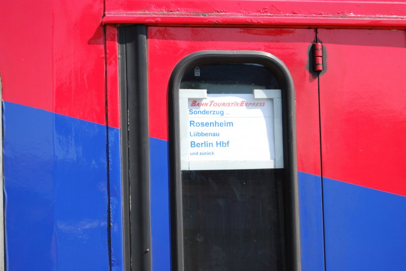 Zuglauf-Schild des Sonderzuges des Bahn-Touristik-Express in Lübbenau.