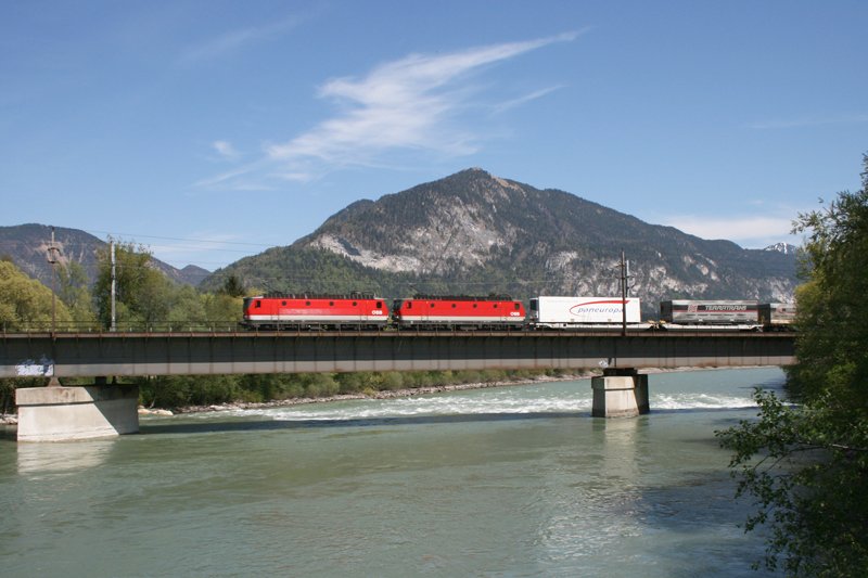 Zwei 1x44 mit einem KLV Zug am 25.04.2009 auf der Innbrücke bei Brixlegg.