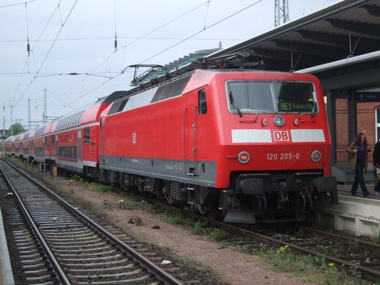 Die ZDF-Lok (120 151-6) bei der Durchfahrt im Bahnhof Plochingen Richtung Stuttgart am 5.05.2009.