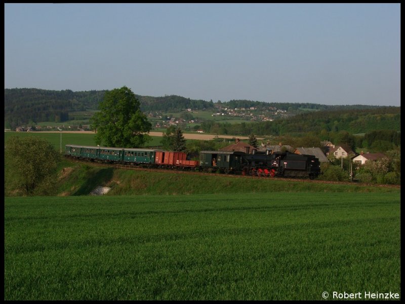 DT1.07 und 2050.04 mit Sonderzug von Wien Südbahnhof (Ostseite) nach Ernstbrunn am 03.05.2009. Im Hintergrund befindet sich die "Wallfahrtskirche Hl. Dreifaltigkeit Karnabrunn", welche Graf Bucellini und seine Frau um 1679 errichten ließen, als Dankbarkeit, weil sie von der Pest verschon wurden.