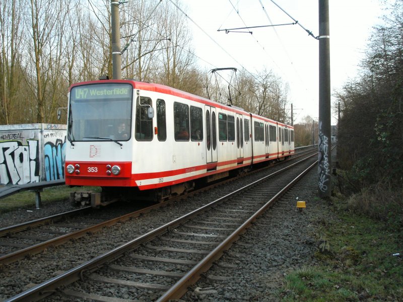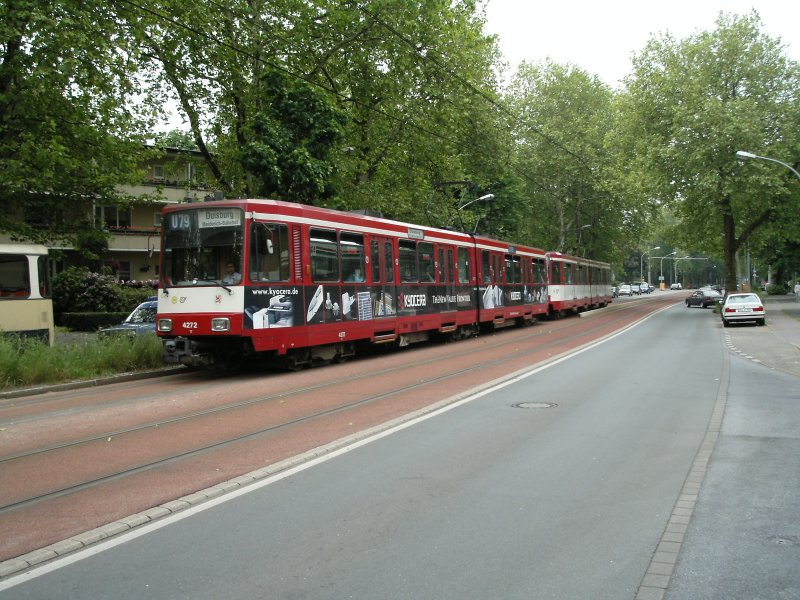Eine Doppeltraktion aus Stadtbahnwagen B der Rheinbahn an der Haltestelle  Kulturstraße  in Duisburg als Zug der Linie U79 nach Duisburg-Meiderich - 02.06.2004.