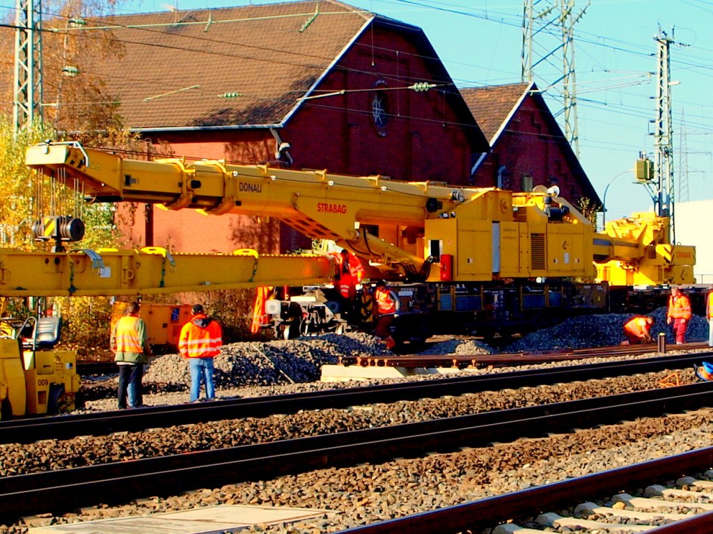 Der 150to. Schienenkran "Donau" mit seinem gewaltigen Kontergewicht holt das nächste Bauteil für eine Doppelkreutzweiche in Herzogenrath.