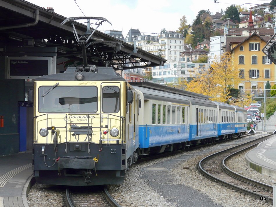 MOB - Vergoldete GDe 4/ 6002 " Train du Chocolat " im Bahnhof Montreux vor einem Schnellzug nach Zweisimmen am 08.11.2009