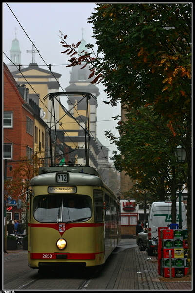 In den nächsten Jahren ist dieser Abschnitt in der Innenstadt untertunnelt. 2658 und sein treuer Begleiter 1647 fahren in die Haltestelle Heinrich Heine Allee ein.