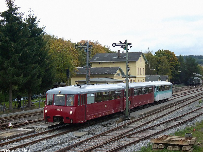 Da erst jetzt der Bahnbilder-Server wieder mit macht, folgen die anderen Bilder etwas später. 772 367, 972 771 und 171 056 bei der Ausfahrt aus dem Bahnhof Schlettau am 03.10.2009