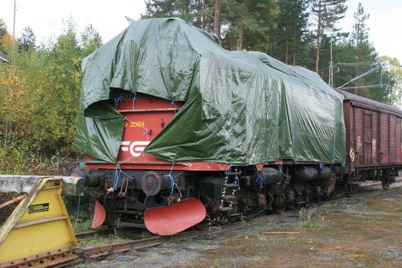 Unter dieser Plane verbirgt sich eine sehr seltene El 9. Genauer gesagt die El 9.2064. Da sie in braunem Farbkleid ist, ist es schon ärgerlich, dass sie verdeckt ist. Aber der Witterungsschutz ist auch verständlich bei so einem seltenen Exemplar. Tinnoset, 27.09.2009