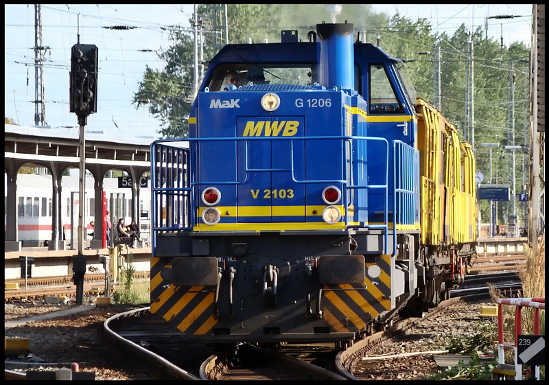 V2103 von -MWB- verlässt mit einem Schienenverleger den Hbf Stralsund.