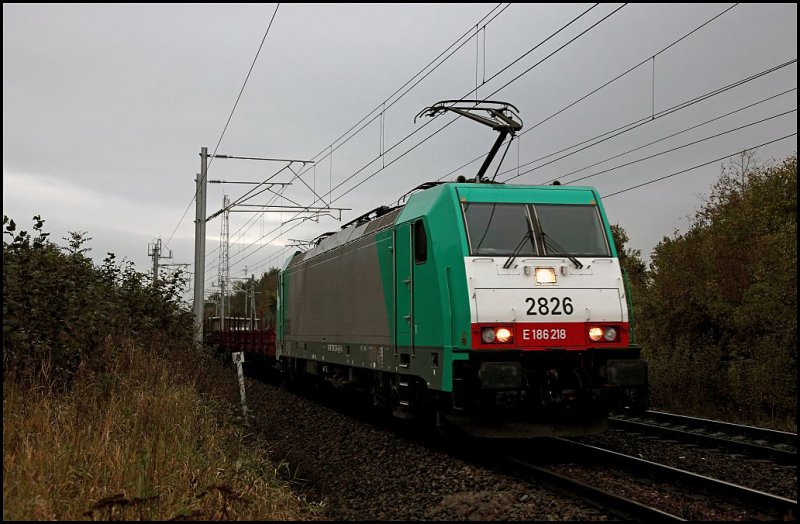 Der heutige Tag wurde mal genutzt um der Montzenroute einen Besuch abzustatten. Nachdem es am Morgen geschüttet hat, wurde es langsam besser... Um 8.24 Uhr am Morgen des 22.10.2009 ist E186 218 (2826) bei Gemmenich mit einem gemischten Güterzug nach Gremberg unterwegs.