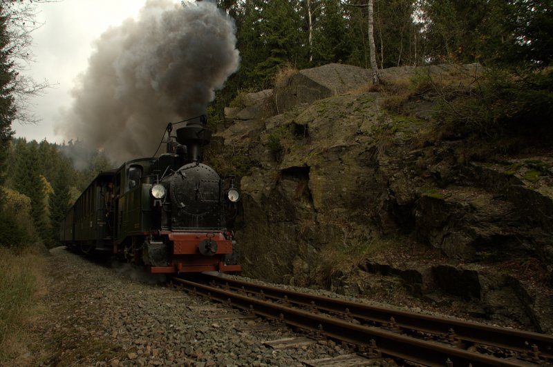 Hier 99 7236-9 der HSB mit einem Zug nach Wernigerode, bei der Ausfahrt am 20.10.2009 aus dem Bahnhof "Brocken".
