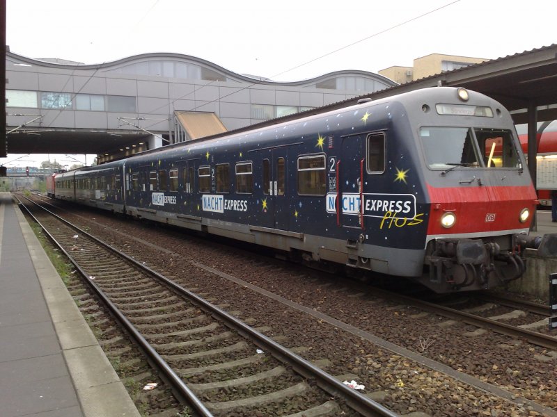 Talgo-Hotelzug von München nach Berlin beim planm. Betriebsaufenthalt am (für diese Jahreszeit immer noch) herrlich grünen Bahnsteig in Schkopau am 22.10.2009, um 4:21 Uhr.